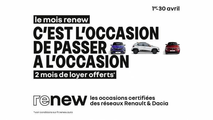 Du 1er au 30 avril, le Mois Renew vous permet de bénéficier de 2 mois de loyer offerts sur une sélection de voitures d’occasion Renault et Dacia. Cette opération nationale relayée par BodemerAuto, réseau de concessions leader du Grand Ouest, concerne plus de 2000 véhicules d’occasion disponibles en Bretagne et en Normandie. Citadine, SUV, berline, utilitaire, essence, hybride, véhicule récent ou faible kilométrage : tous les profils d’automobilistes peuvent trouver l’occasion qui leur correspond.